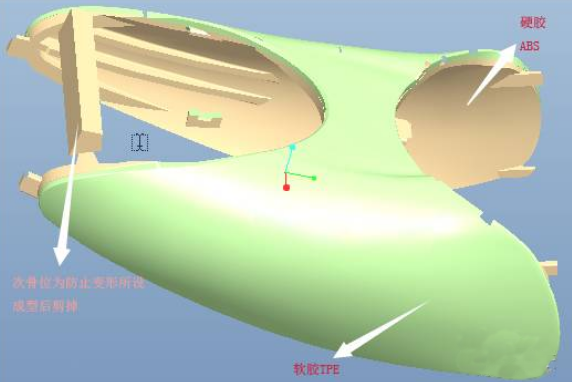 硬膠ABS采用兩點進(jìn)膠,一點位于塑件頂部,成型后被軟膠TPE所覆蓋,另一點在工藝骨位上,最后被剪掉。軟膠TPE一點進(jìn)膠,同樣在塑件的頂部邊緣,成型后產(chǎn)品組裝時可以被蓋住。